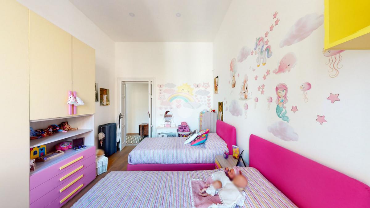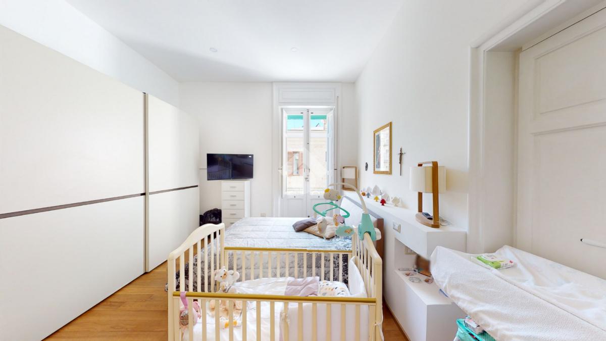 A seguire, per ordine, è presente una delle due camere da letto, dalle dimensioni di 21 mq e con accesso su di un ulteriore balcone.