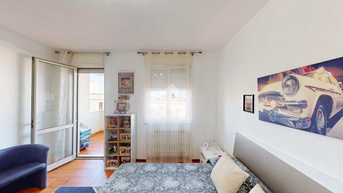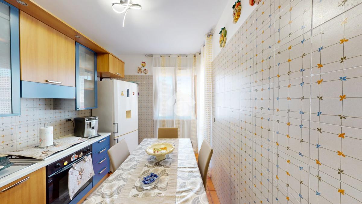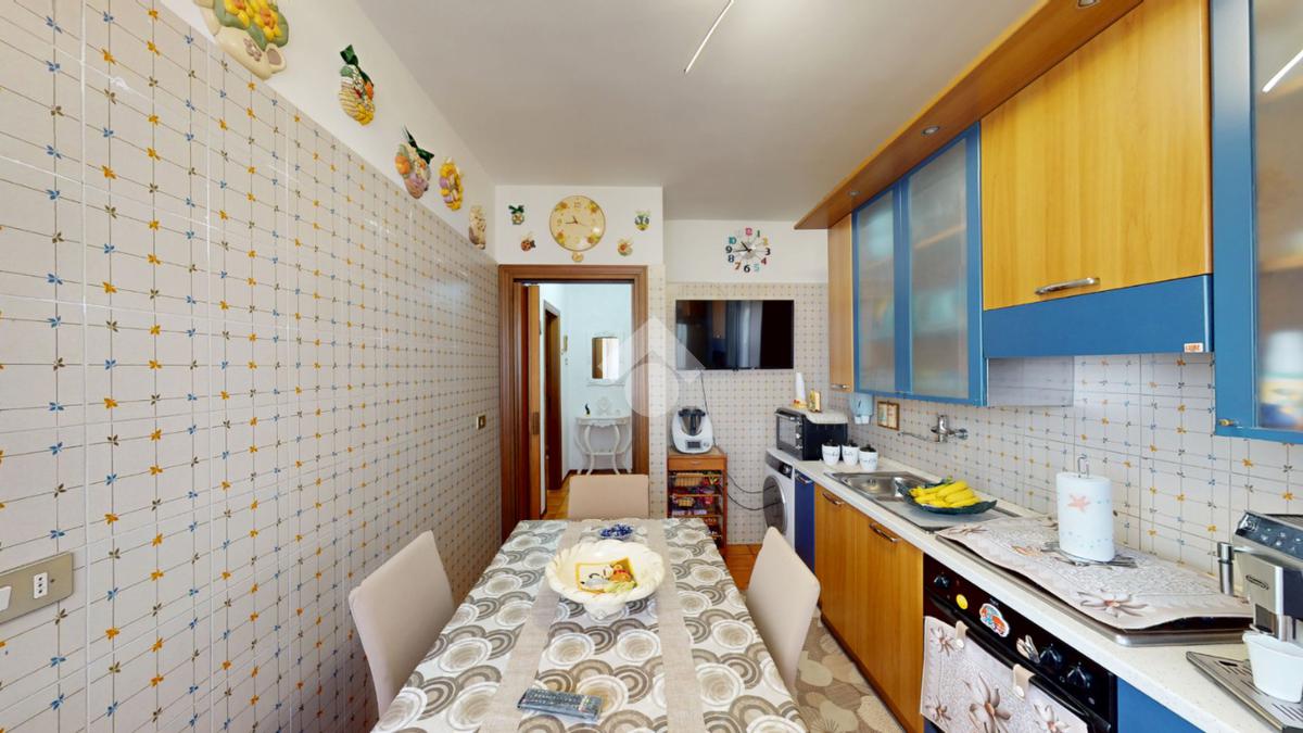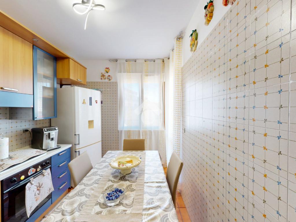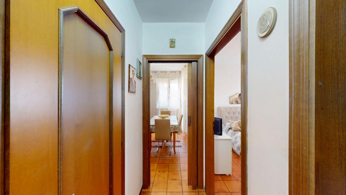 Un disimpegno conduce alla cucina, per ultimare la zona giorno, con accesso al balcone.