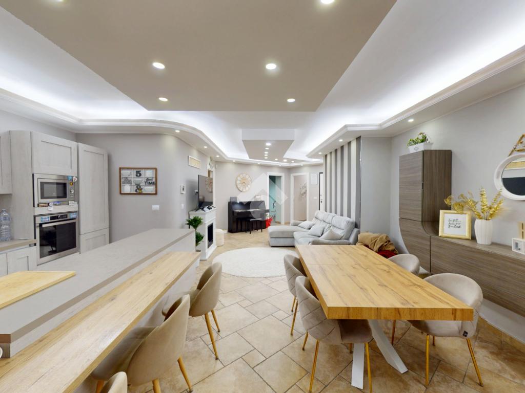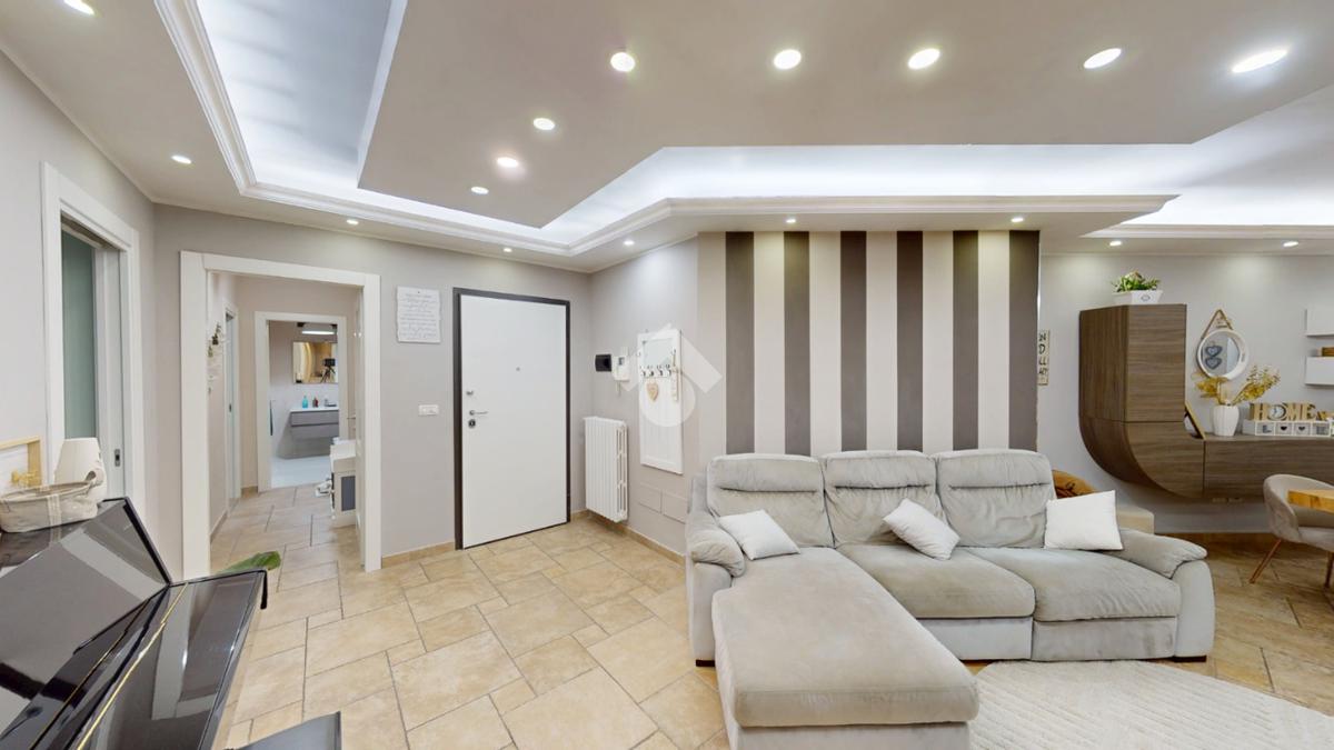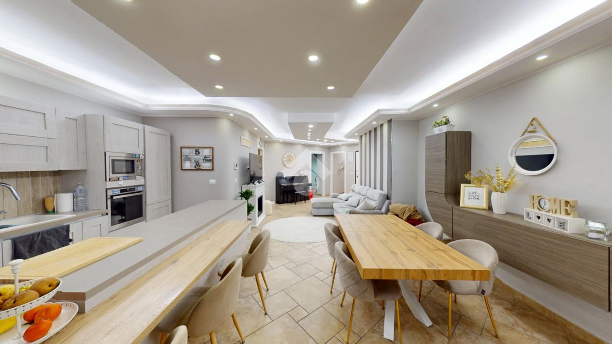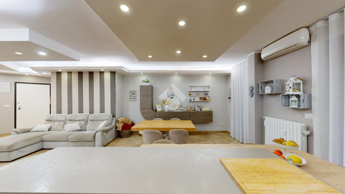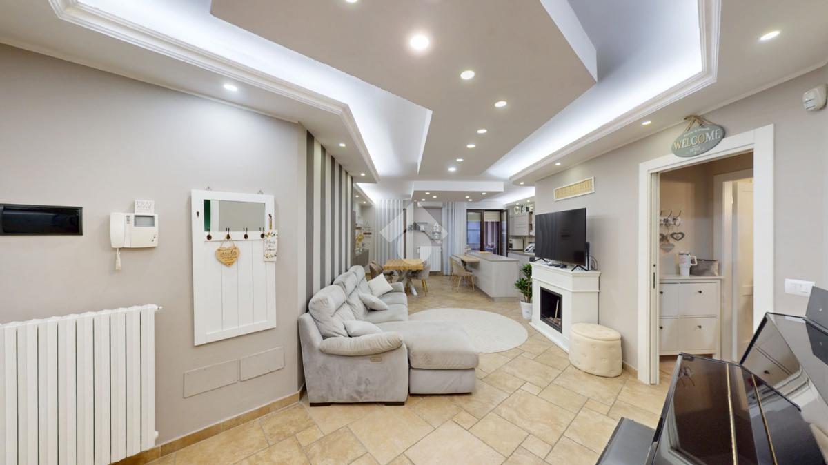 La zona giorno dispone di controsoffitto con faretti volti ad illuminare l'intero ambiente, rendendolo moderno ed elegante.
