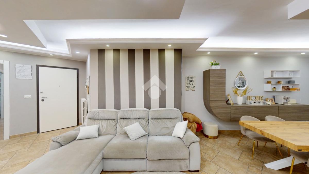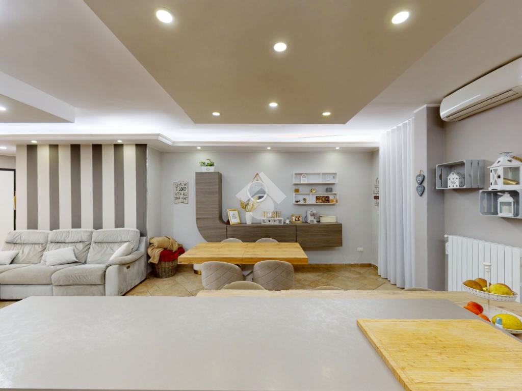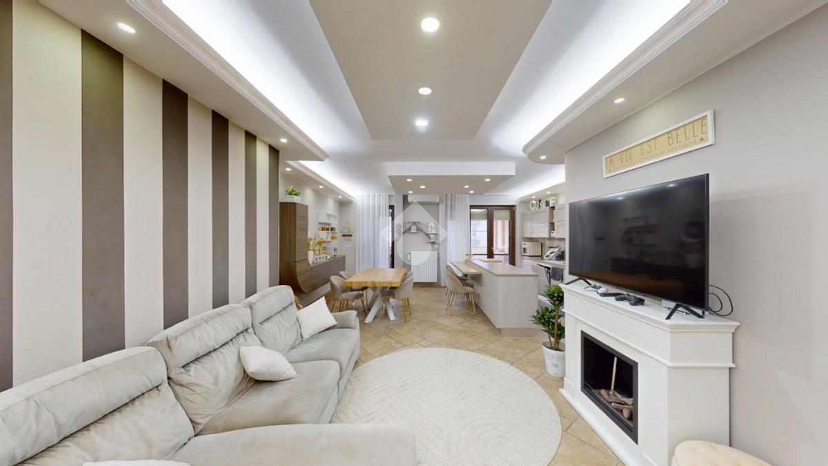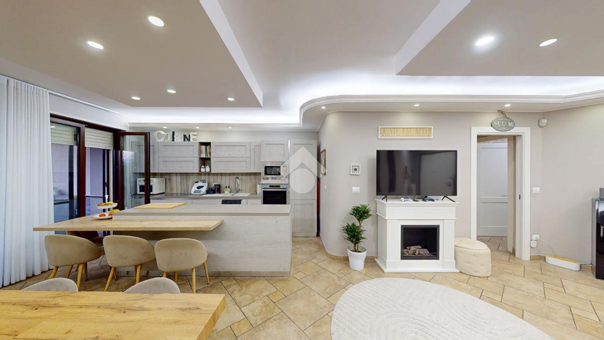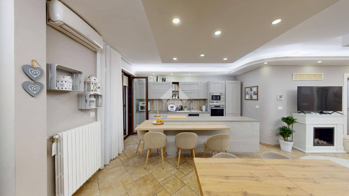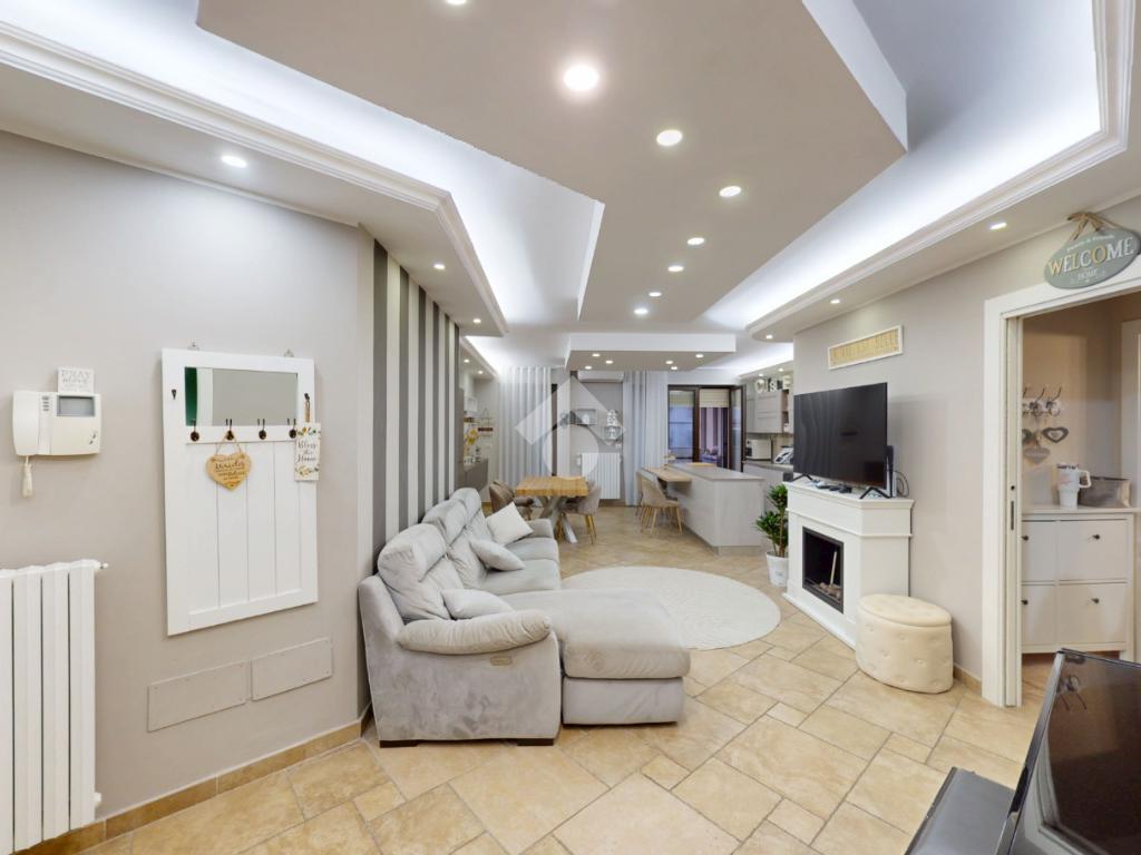 La zona giorno dispone di controsoffitto con faretti volti ad illuminare l'intero ambiente, rendendolo moderno ed elegante.