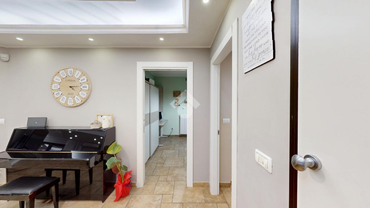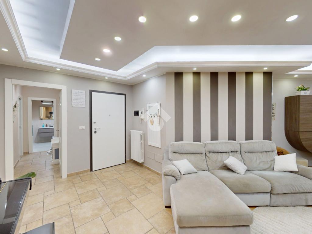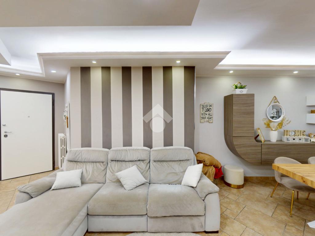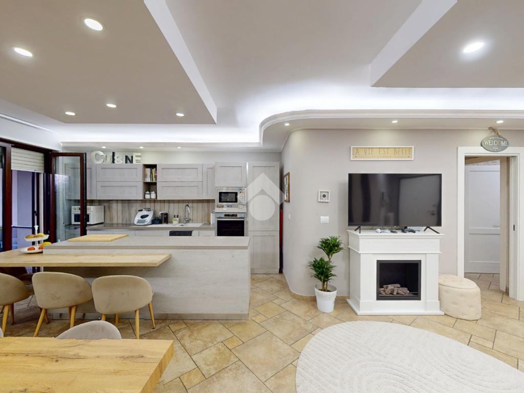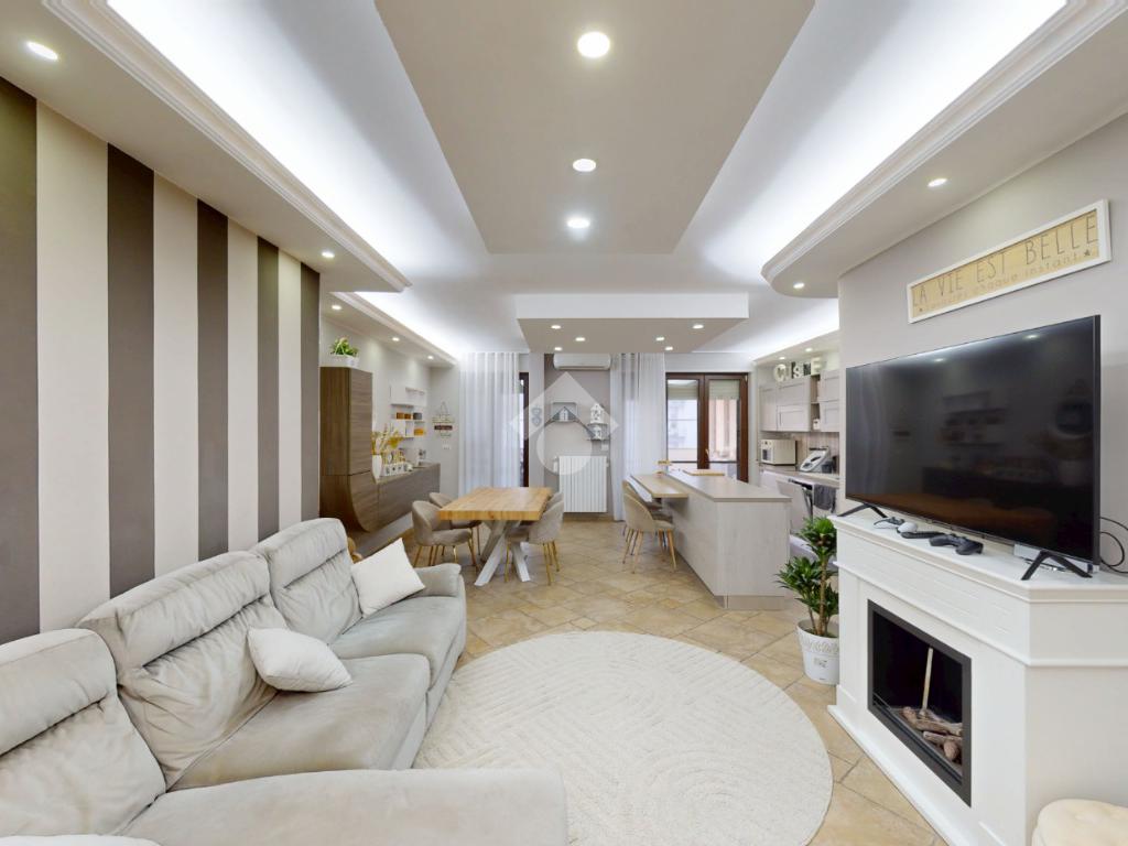 La zona giorno dispone di controsoffitto con faretti volti ad illuminare l'intero ambiente, rendendolo moderno ed elegante.