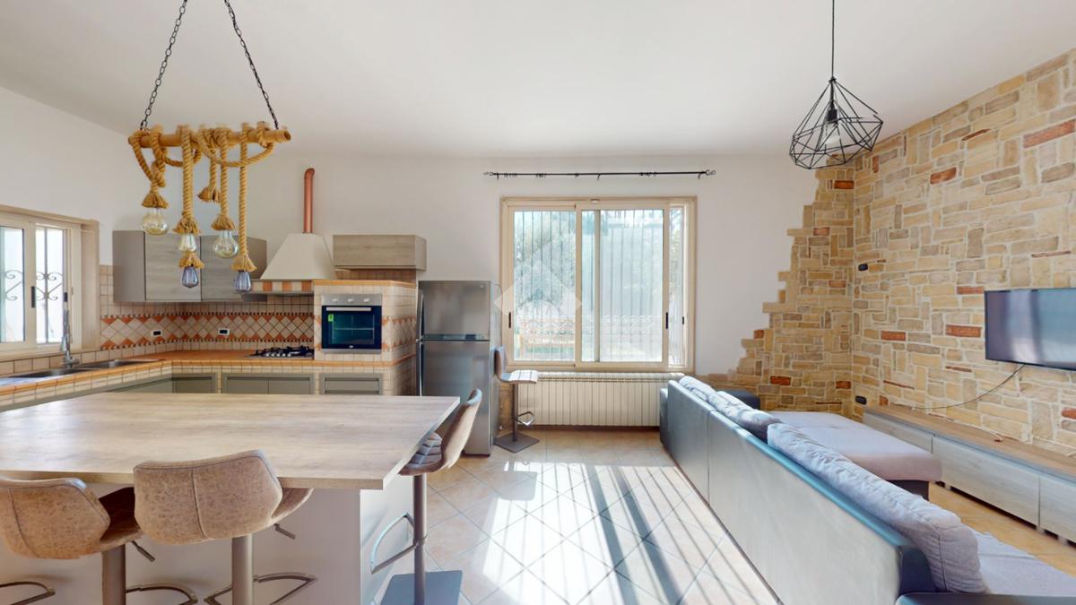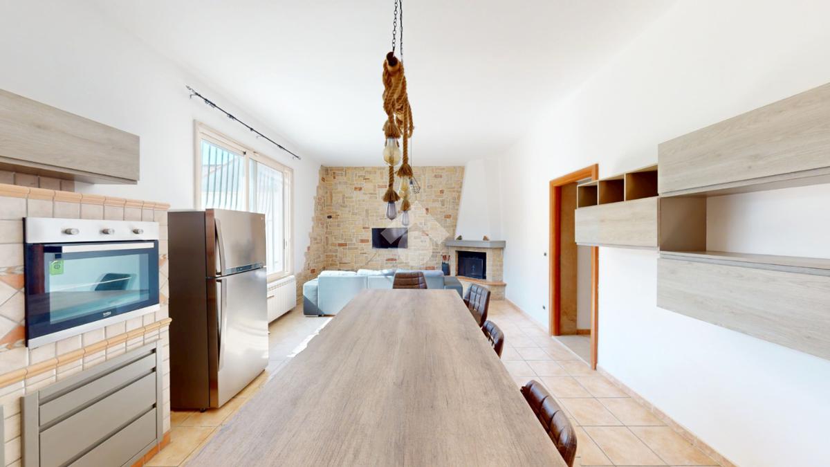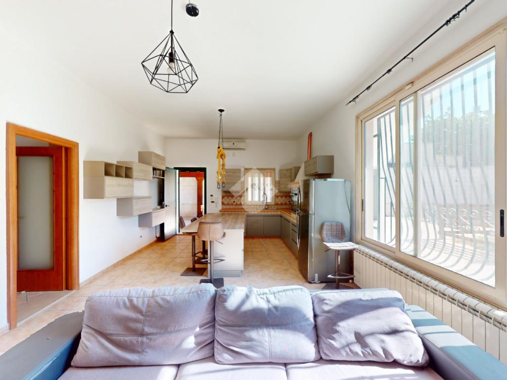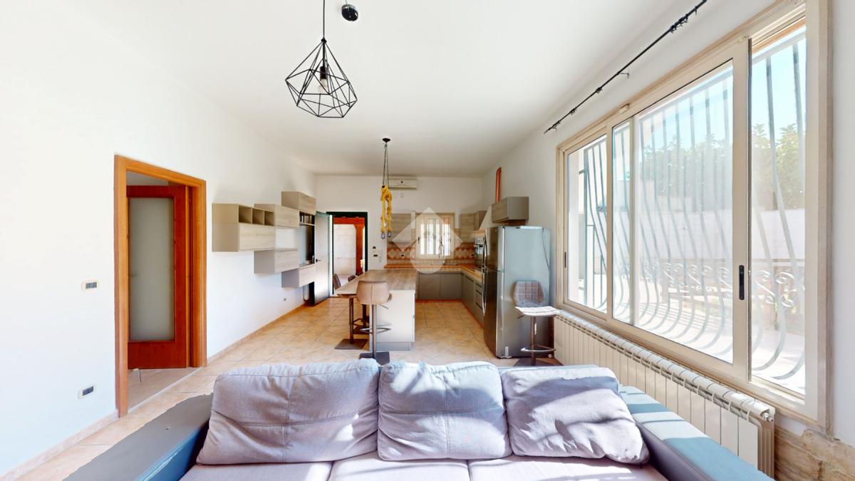 Un ampio giardino, dalle dimensioni totali di 300 mq circa, dà l'accesso all'abitazione: per ordine, una veranda ed a seguire un ampio e luminso soggiorno pranzo con angolo cottura a vista.